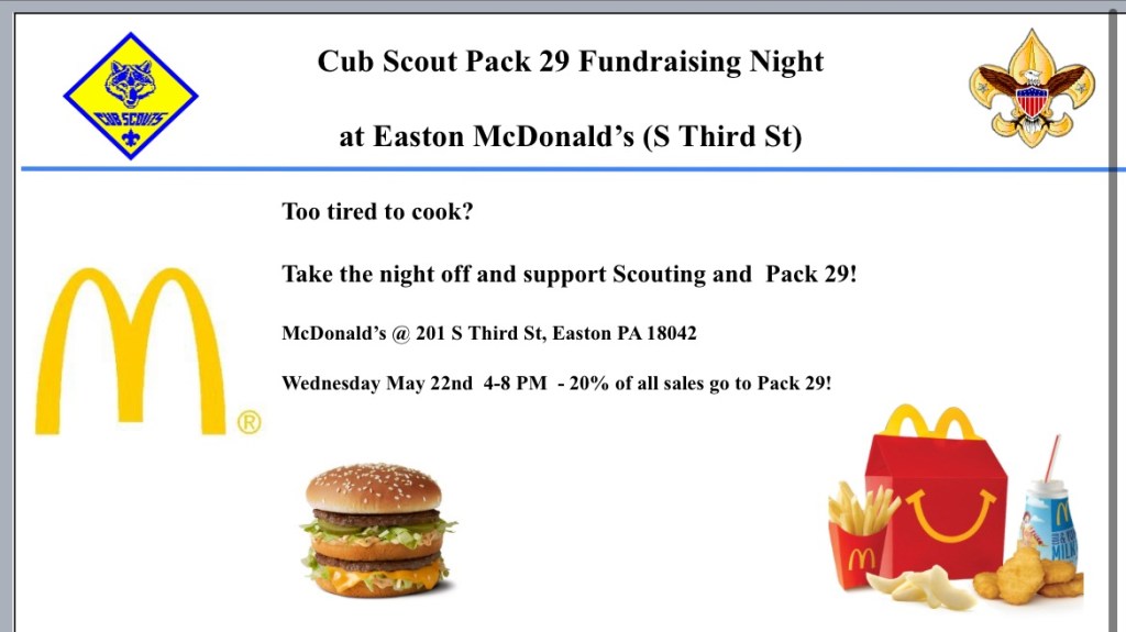 Tell your family, friends, neighbors and co-workers to come out and support Pack 29 at the Easton 3rd st McDonalds next Wednesday May 22nd!