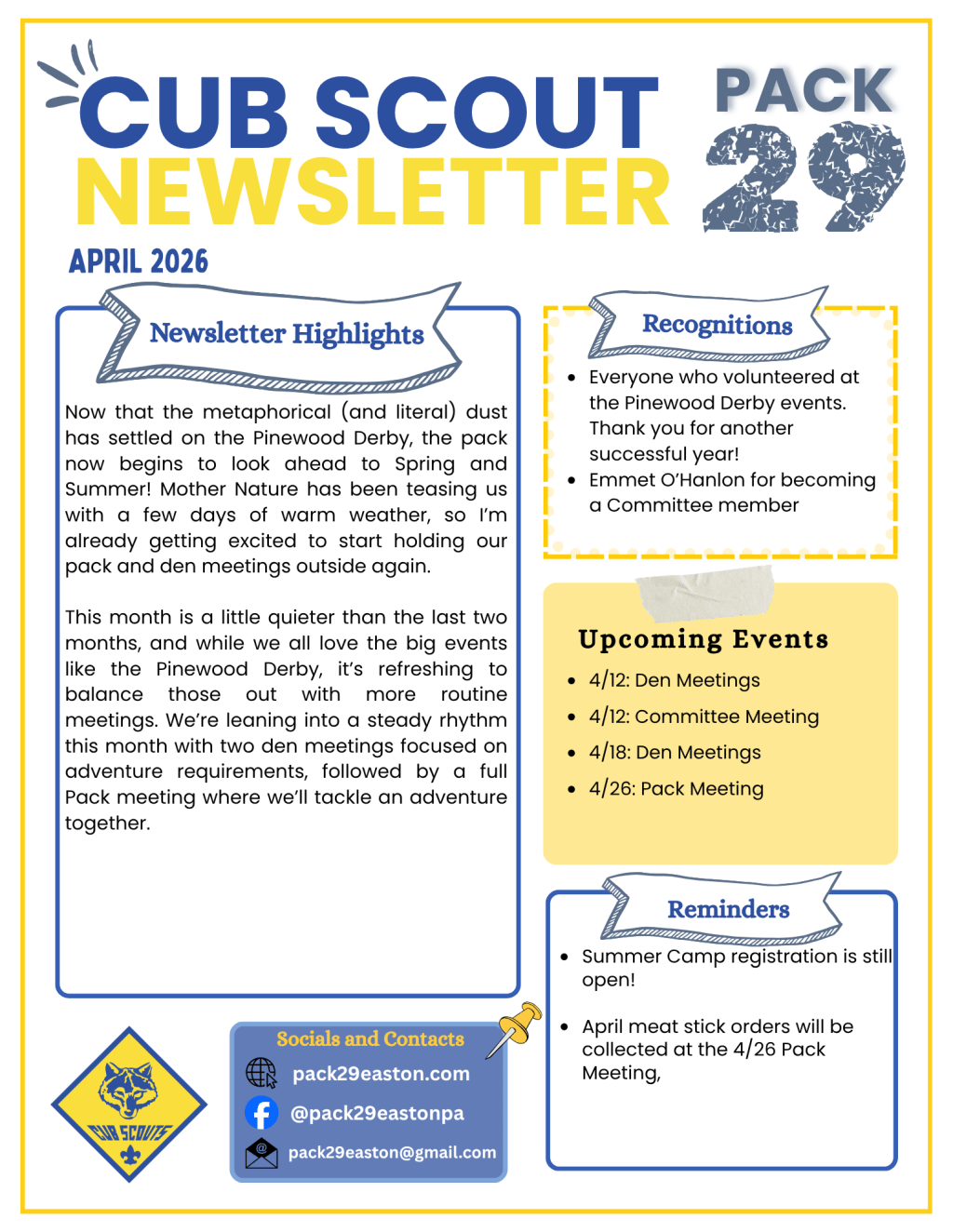 I’ll be sending an email to all families with details about each position and additional information to those adults who have already expressed interest in volunteering. If you’re interested in helping in any capacity, please reach out to Mike Ehret (pack29easton@gmail.com)!